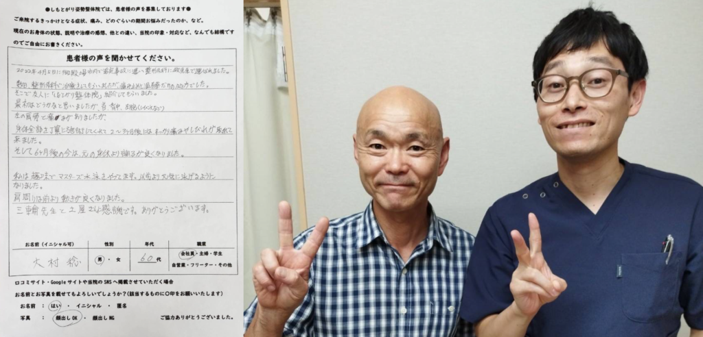 私は趣味でマスターズ水泳をやっています。以前より元気に泳げるようになりました。肩周りは前より動きが良くなりました。