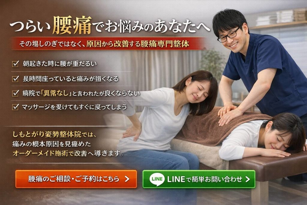 しもとがり姿勢整体院では、「その場だけ楽になる」ことではなく、痛みを繰り返さない身体づくりを目標としています。